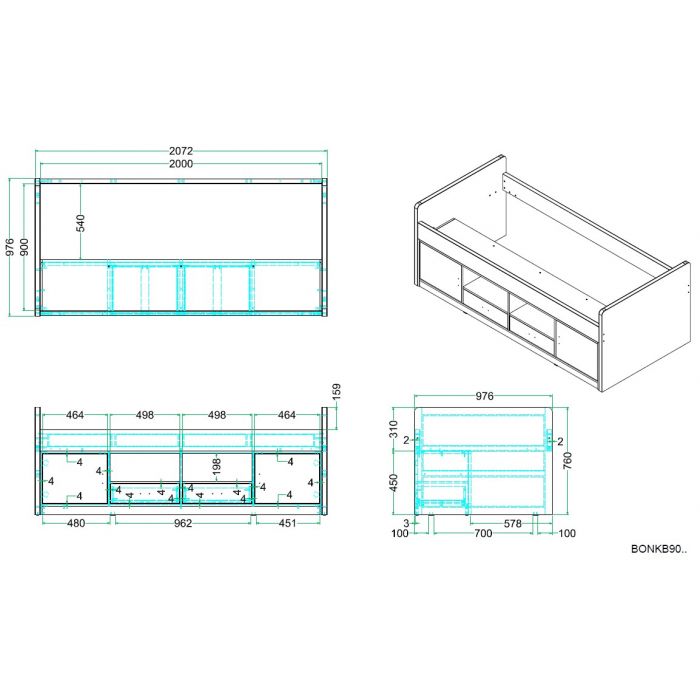 This space-saving BONNY cabin bed in light pink has 2 cabinets with a door and in the middle 2 drawers with a shelf above.