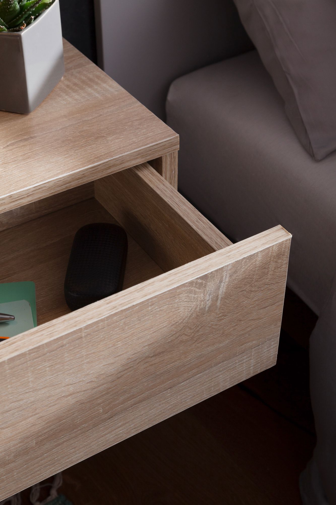 Wisząca konsola nocna o ponadczasowym designie, idealna do optymalizacji przestrzeni w sypialni. Prosta, prostokątna powierzchnia pomieści lampę, budzik i inne niezbędne przedmioty. Wysuwana szuflada oferuje praktyczne miejsce do przechowywania książek, okularów i leków.