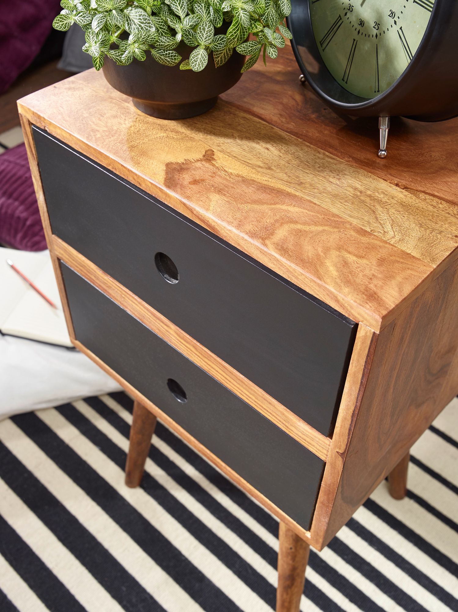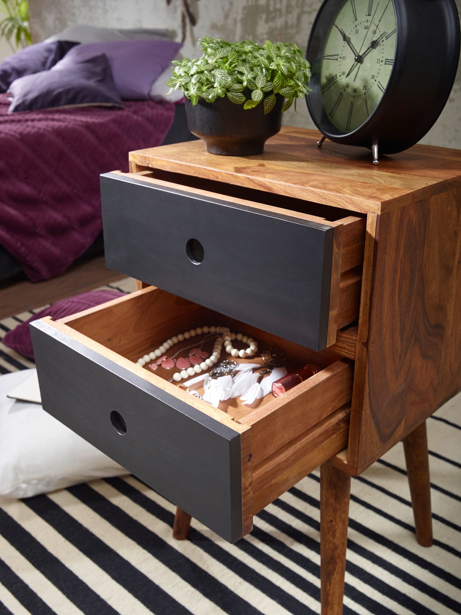 Retro repa / stolik nocny z drewna sheesham z 2 szufladami ciemnobrązowy / czarny konstrukcja szafka nocna 40 x 35 x 55 cm