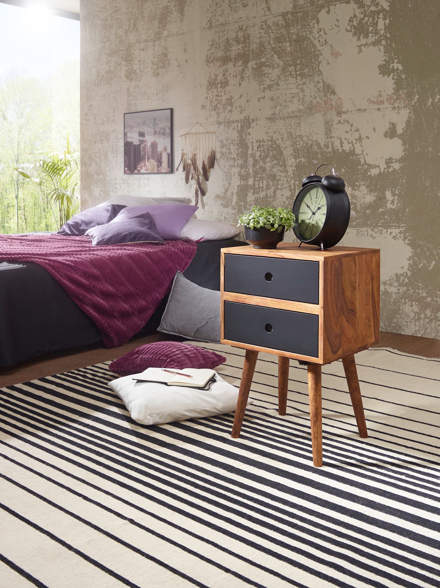 Informacje dot. produktu "Retro repa / stolik nocny z drewna sheesham z 2 szufladami ciemnobrązowy / czarny konstrukcja szafka nocna 40 x 35 x 55 cm"