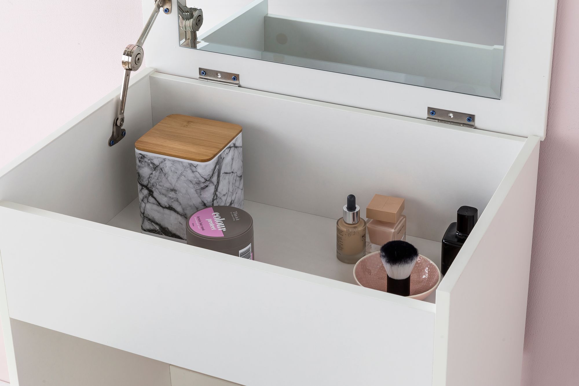 Nowoczesna biała toaletka z dużym lustrem i stylowym dwukolorowym stołkiem (czarno-białym). Przestronna składana komora pozwala na wygodne przechowywanie kosmetyków, perfum i akcesoriów.