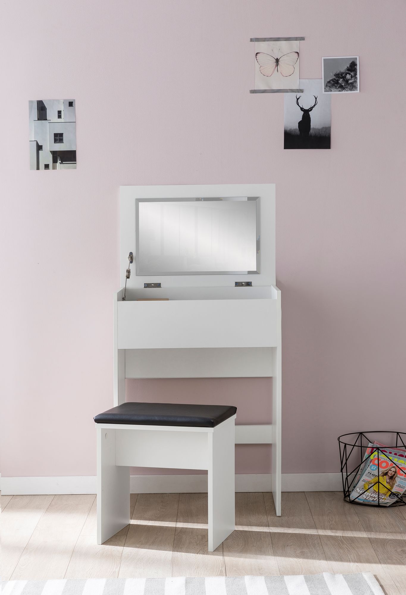 Biały drewniany toaletka z lustrem i stołkiem | Kolor biały/czarny | Wymiary 60x81x40 cm