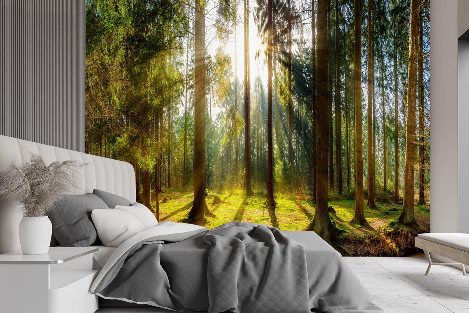 - Zdjęcie na ścianę z krajobrazem promieni słońca w lesie.