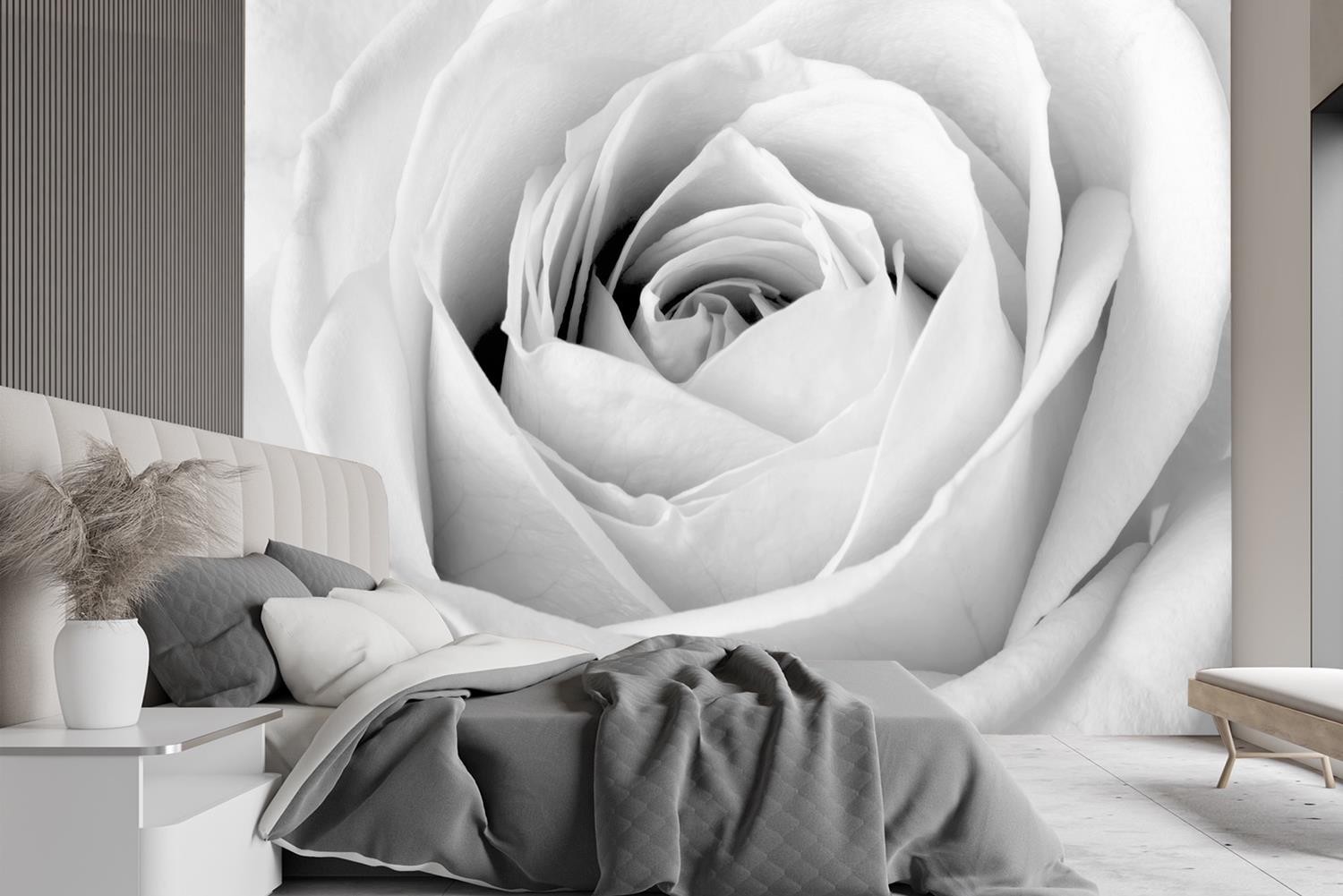 Informacje dot. produktu "Fototapeta do salonu z wizerunkiem białej róży w czarno-białej kolorystyce"